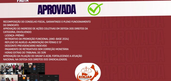 A Assembleia também aprovou a filiação do SINJAP à Associação dos Servidores e das Servidoras do Judiciário Brasileiro (ASJB), com o objetivo de fortalecer a atuação institucional em âmbito nacional, ampliar a articulação sindical e reforçar a defesa das garantias, direitos e prerrogativas da categoria.