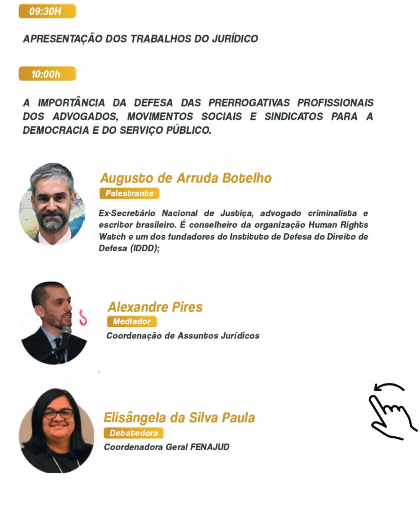 🔹 10h00 – Mesa: A importância da defesa das prerrogativas profissionais dos advogados, movimentos sociais e sindicatos para a democracia e o serviço público