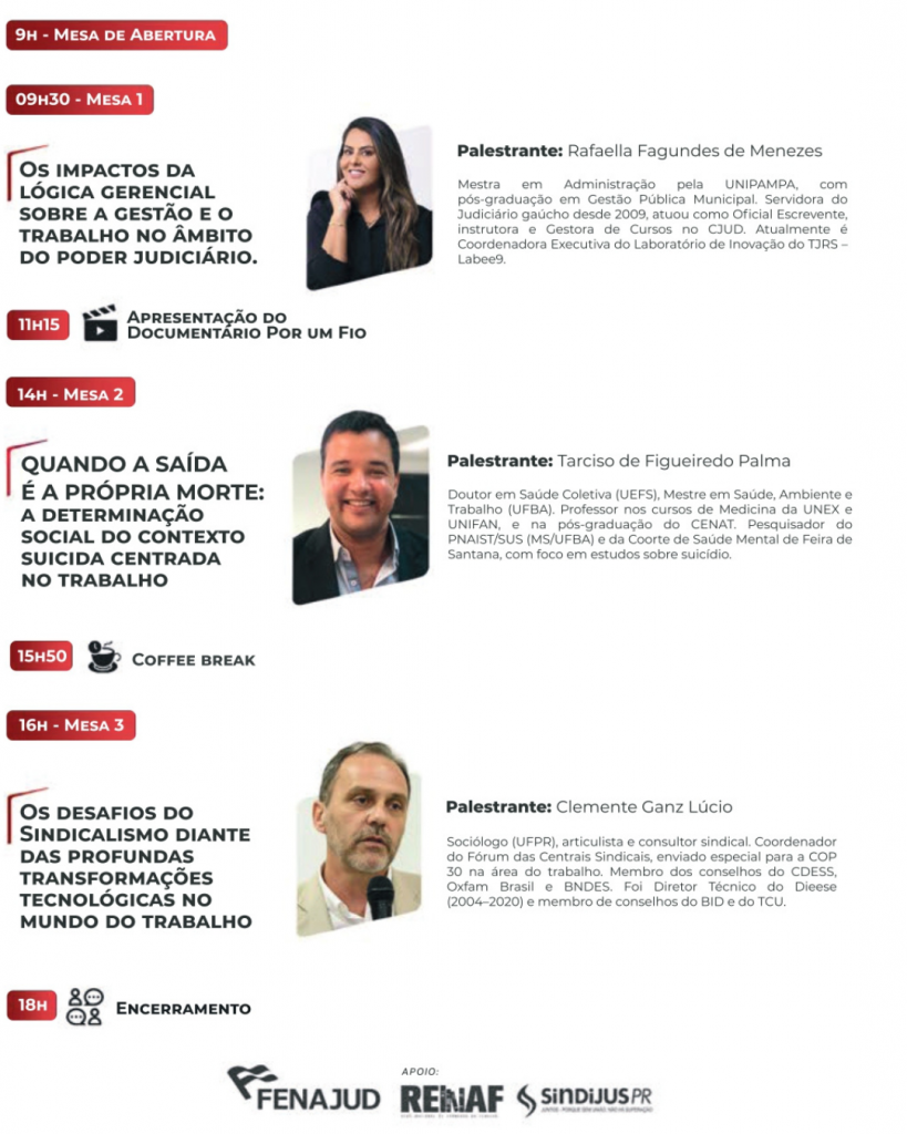 🔹 16h30 – Mesa: O caráter punitivo do Judiciário: impactos sobre servidores e população (PADs/Sindicâncias)