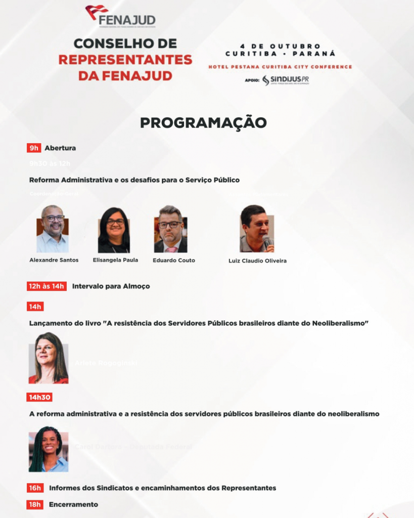 Entre os dias 02 e 04 de outubro de 2025, a Federação Nacional dos Trabalhadores do Judiciário nos Estados (FENAJUD) realizará, em Curitiba/PR, uma ampla programação de debates, formações e deliberações sobre os rumos do serviço público e a defesa dos direitos da categoria.